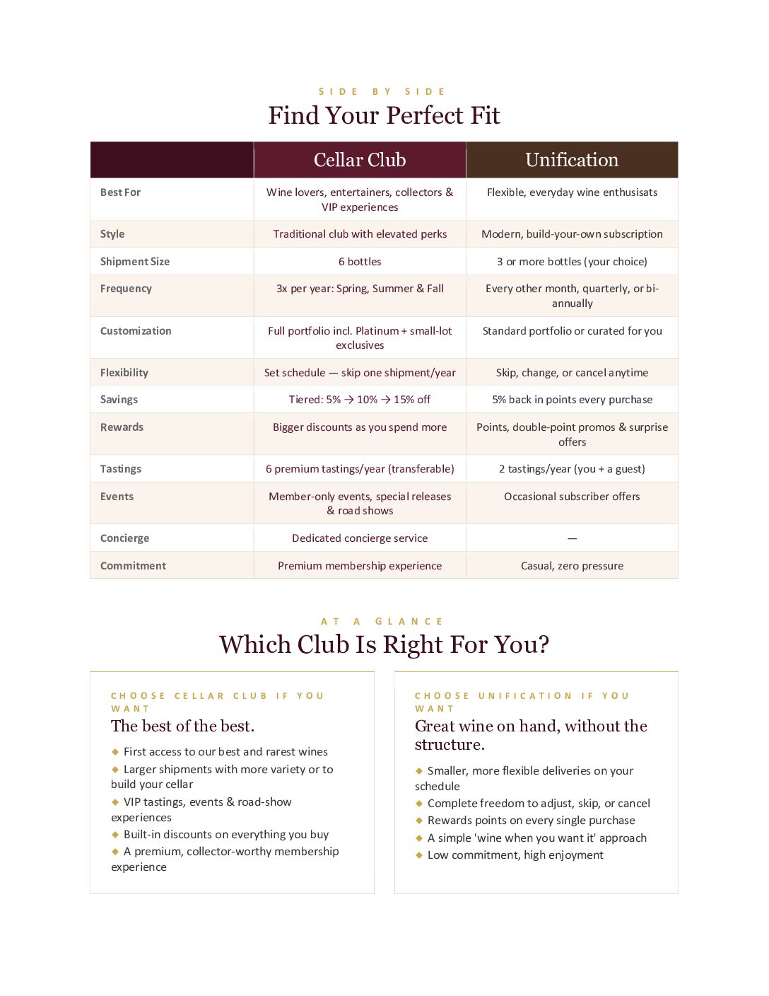 Many members start with Unification for flexibility and upgrade to Cellar when they want deeper perks and exclusive access.